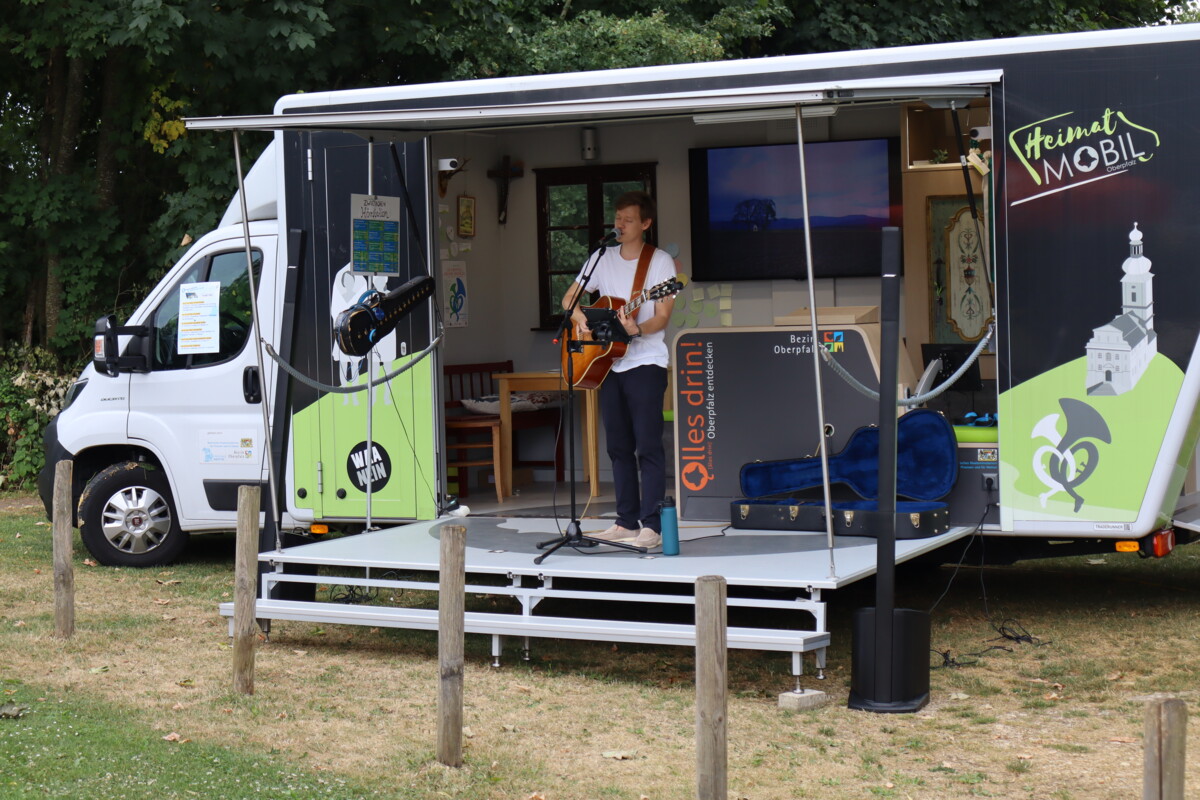 - Auch beim Halt am Schwetzendorfer Weiher ging es musikalisch zu: Die Band „Da Spoon & I“ sorgte auf der Bühne des Heimatmobils für entspannte Feierabendstimmung, während das Team des Kiosks die Gäste verpflegte.