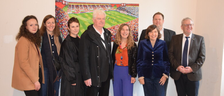 Carina Neuffer (Kebbel-Villa), die Kunstschaffenden Jasmin Schmidt, Barbara Muhr, Alois Öllinger, Katharina Gierlach, Hausherrin Daniela Schönharting, Bezirksheimatpfleger Dr. Tobias Appl und Schwandorfs Oberbürgermeister Andreas Feller (von links) vor dem Fußballgemälde. (Foto: Bastian Schreiner)