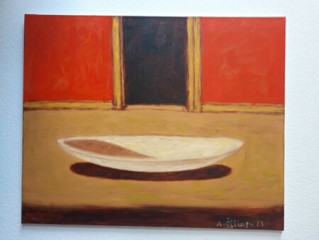 „Im Gesamtwerk des Malers, Bildhauers und Aktionskünstlers Alois Öllinger hängt alles mit allem zusammen“, schreibt Anjalie Chaubal in einem früheren Katalogtext. Der Bezirk hat im letzten Jahr eine Ölmalerei des in Bad Kötzting lebenden Künstlers angekauft, die eine Schale in einem Innenraum darstellt. Ihre Bildarchitektur zielt auf Ruhe und Stabilität. Als plastisches Werk aus Polyester, Marmorstaub und Gold sowie Sinnbild für Harmonie und Ausgewogenheit taucht die Schale wiederholt in der Bilderwelt Öllingers auf.