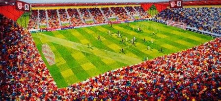 „SSV Jahn Regensburg“ titelt Katharina Gierlach (* 1983) ihre großformatige – live angefertigte – Perspektive auf das Jahnstadion in Regensburg von 2017. Der in starken Kontrasten ebenso pastose wie plastische Farbauftrag in Öl wurde zum Markenzeichen der in Winklarn geborenen und in Köln lebenden Künstlerin, die an der Akademie der Bildenden Künste in Nürnberg studierte. Dabei ist das Jahnstadion in Regensburg nicht das einzige Stadionportrait der fußballbegeisterten Künstlerin.