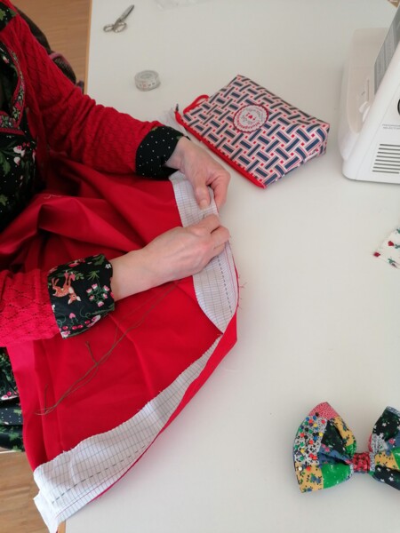Im Kurs werden traditionelle Verarbeitungstechniken wie z. B. Falten, Stifteln oder Reihen, das Anbringen von Bindebändern oder Schürzenschließen, Biesen oder aufgesteppte Bänder am Saum vermittelt.
